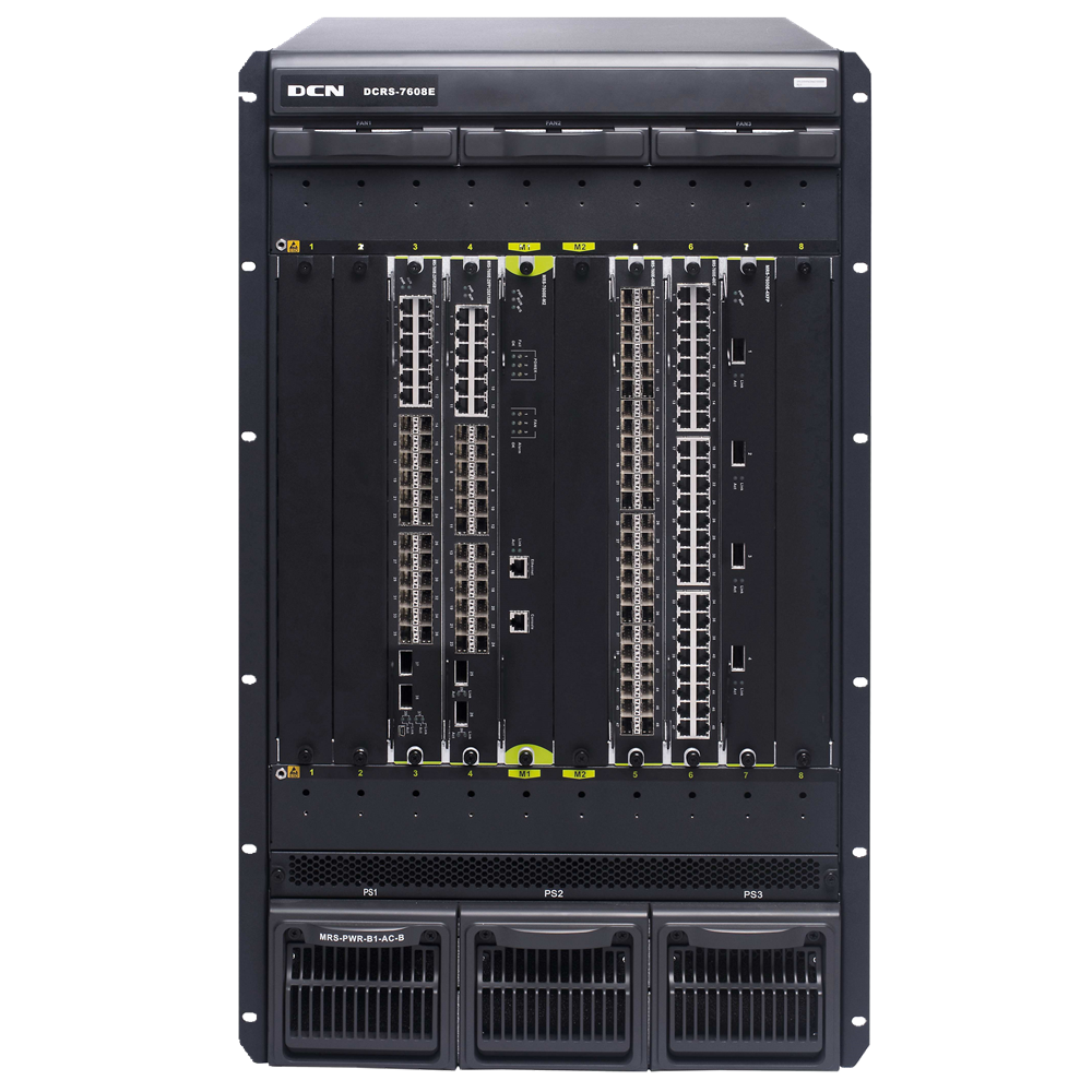 | DCRS-7608E | DCRS-7608E(R3.0)机箱式路由交换机主机(8个业务插槽,2个管理引擎插槽,研讨电源2+1冗余),标配1个MRS-PWR-AC-B研讨电源,满配风扇盘,不含管理引擎模块 |