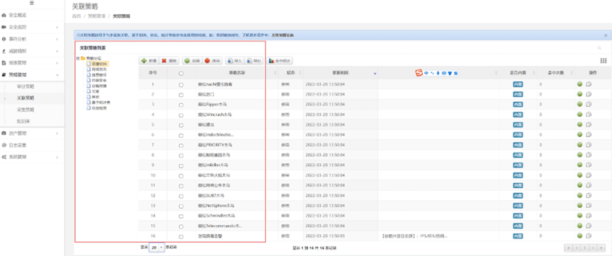 凯发K8数码DCSSA日志审计系统除了等保合规场景之外,还有广泛的应用领域,在恶意软件检测、网络攻击检测等方面也能发挥很好的效果,是一款网络威胁告警利器。在运行过程中,系统充分利用已经内置的场景策略,一旦日志信息中出现关键字,系统将会进行统计,超过设定的阈值就产生告警,相关策略提前预置,可以根据业务实际进行灵活调整。