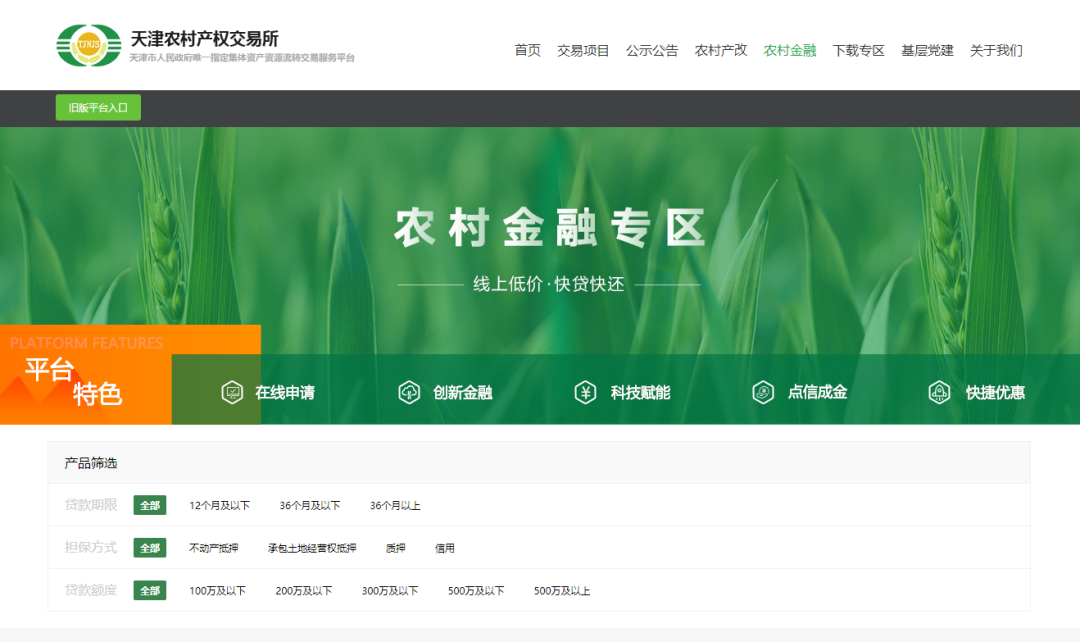农村金融综合服务平台首批6支金融产品已开通在线申请通道,此次申请通道的开通,标志着天津农村产权交易所农村金融综合服务平台正式上线。首批发布的三家银行的共6支金融产品均面向全市农业种养殖户及合作社、家庭农场、农业企业等新型农业经营主体。申请人可登录天津农村产权交易所官方网站(www.tjnjs.com)农村金融专区进行在线申请,按照审核要求填写申请信息并上传申请资料,初审顺利获得后,银行将安排专人对接完成后续申请流程。