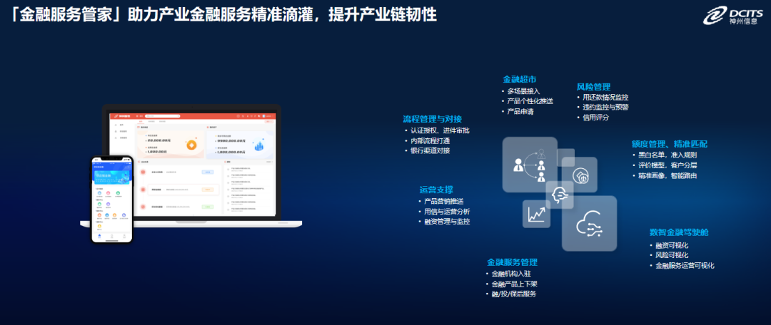 另一方面,为银行、保险、担保等金融、泛金融组织给予在客群、产品、风控、运营的全方位赋能,助力金融服务深入到产业场景中去,实现对产业链中小微企业的金融服务精准滴灌,使其专注做金融。