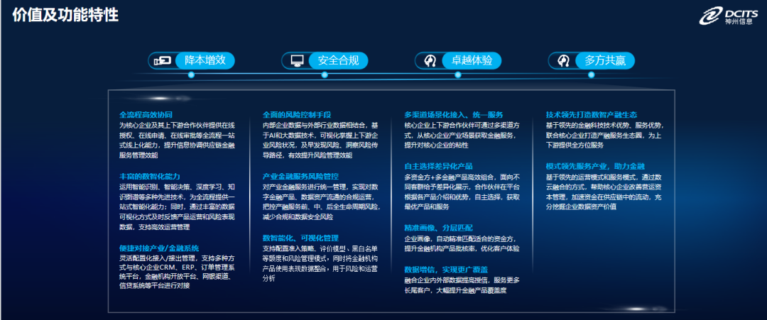 以下是产融DaaS产品的价值及功能特性,总结起来十六个字“降本增效、安全合规、卓越体验、多方共赢”